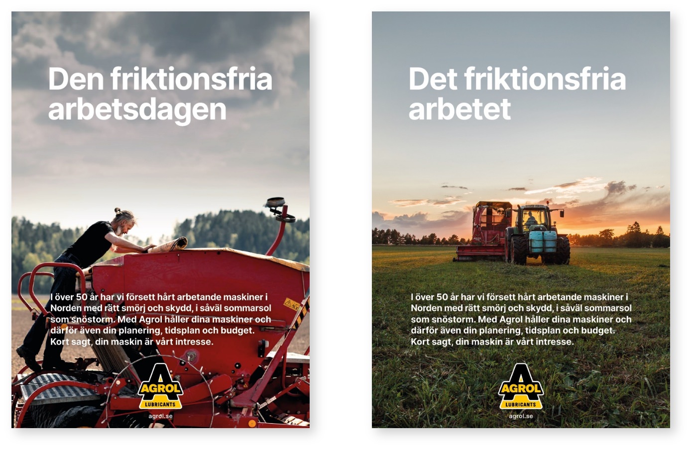 Agrol producerar smörjmedel som gör att stora maskiner i Norden håller längre och presterar bättre. Vi har skapat koncept, content och kampanjer som gör det rätta smörjvalet till det lätta smörjvalet.